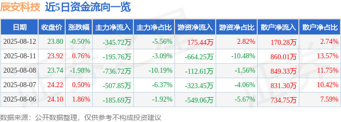 证券之星消息,截至2025年8月12日收盘,辰安科技(300523)报收于23.8元,下跌0.5%,换手率1.13%,成交量2.62万手,成交额6221.94万元。