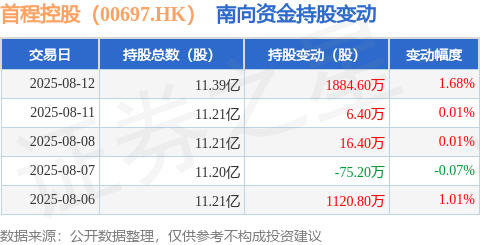 证券之星消息,8月12日南向资金增持1884.6万股首程控股(00697.HK)。近5个交易日中,获南向资金增持的有4天,累计净增持2953.0万股。近20个交易日中,获南向资金增持的有18天,累计净增持3.49亿股。截至目前,南向资金持有首程控股(00697.HK)11.39亿股,占公司已发行普通股的14.7%。