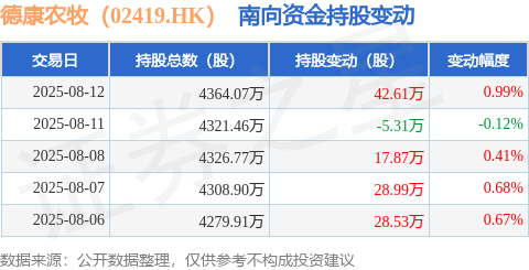 证券之星消息,8月12日南向资金增持42.61万股德康农牧(02419.HK)。近5个交易日中,获南向资金增持的有4天,累计净增持112.69万股。近20个交易日中,获南向资金增持的有15天,累计净增持587.93万股。截至目前,南向资金持有德康农牧(02419.HK)4364.07万股,占公司已发行普通股的27.68%。