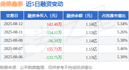 证券之星消息,8月12日,盛德鑫泰(300881)融资买入1094.76万元,融资偿还952.28万元,融资净买入142.48万元,融资余额1.14亿元。