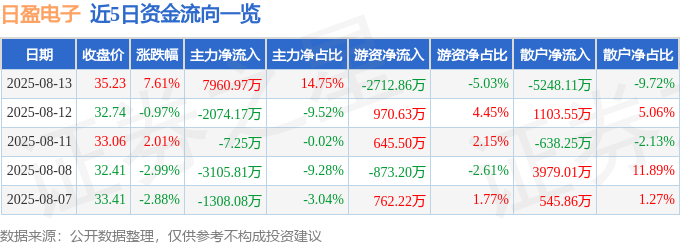 证券之星消息,截至2025年8月13日收盘,日盈电子(603286)报收于35.23元,上涨7.61%,换手率13.72%,成交量15.84万手,成交额5.4亿元。