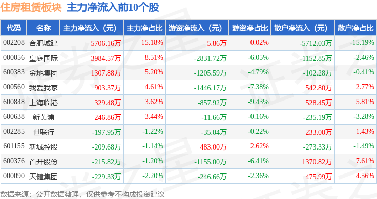 从资金流向上来看,当日住房租赁板块主力资金净流出6.76亿元,游资资金净流入1.56亿元,散户资金净流入5.2亿元。住房租赁板块个股资金流向见下表: