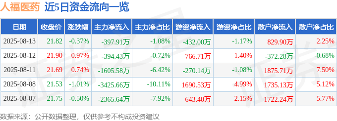 证券之星消息,截至2025年8月13日收盘,人福医药(600079)报收于21.82元,下跌0.37%,换手率1.09%,成交量16.85万手,成交额3.68亿元。