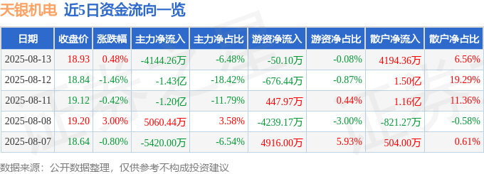 证券之星消息,截至2025年8月13日收盘,天银机电(300342)报收于18.93元,上涨0.48%,换手率8.06%,成交量33.66万手,成交额6.4亿元。