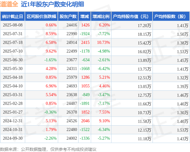 证券之星消息,近日道道全披露,截至2025年8月8日公司股东户数为2.44万户,较7月31日增加1426.0户,增幅为6.2%。户均持股数量由上期的1.5万股减少至1.41万股,户均持股市值为17.2万元。
