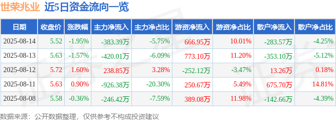 证券之星消息,截至2025年8月14日收盘,世荣兆业(002016)报收于5.52元,下跌1.95%,换手率1.48%,成交量11.94万手,成交额6665.12万元。