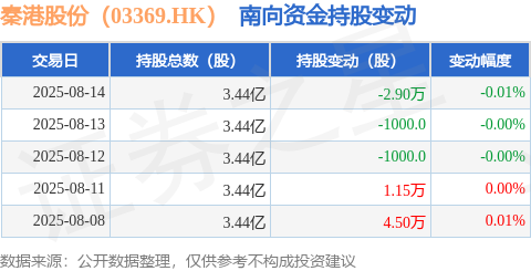 证券之星消息,8月14日南向资金减持2.9万股秦港股份(03369.HK)。近5个交易日中,获南向资金增持的有2天,累计净增持2.55万股。近20个交易日中,获南向资金增持的有14天,累计净增持199.05万股。截至目前,南向资金持有秦港股份(03369.HK)3.44亿股,占公司已发行普通股的41.43%。