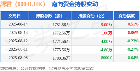 证券之星消息,8月14日南向资金增持9.0万股鹰君(00041.HK)。近5个交易日中,获南向资金增持的有2天,累计净增持4000.0股。近20个交易日中,获南向资金增持的有15天,累计净增持116.2万股。截至目前,南向资金持有鹰君(00041.HK)1781.56万股,占公司已发行普通股的2.37%。