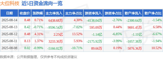 证券之星消息,截至2025年8月14日收盘,大位科技(600589)报收于8.48元,上涨0.71%,换手率11.98%,成交量177.15万手,成交额14.98亿元。