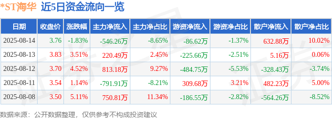 8月14日的资金流向数据方面,主力资金净流出546.26万元,占总成交额8.65%,游资资金净流出86.62万元,占总成交额1.37%,散户资金净流入632.88万元,占总成交额10.02%。