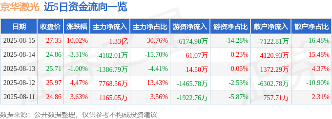 8月15日的资金流向数据方面,主力资金净流入1.33亿元,占总成交额30.76%,游资资金净流出6174.9万元,占总成交额14.28%,散户资金净流出7122.81万元,占总成交额16.48%。