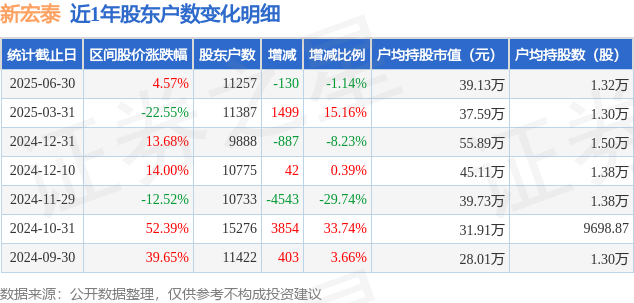 从股价来看,2025年3月31日至2025年6月30日,新宏泰区间涨幅为4.57%,在此期间股东户数减少130.0户,减幅为1.14%。