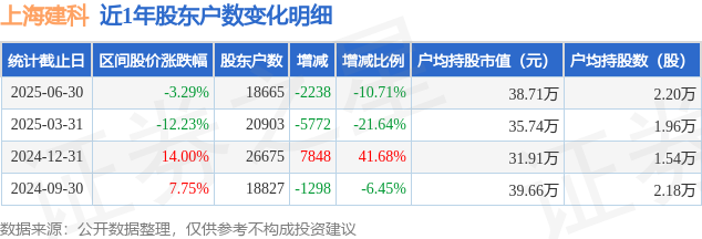从股价来看,2025年3月31日至2025年6月30日,上海建科区间跌幅为3.29%,在此期间股东户数减少2238.0户,减幅为10.71%。