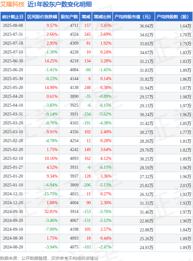 从股价来看,2025年7月31日至2025年8月8日,艾隆科技区间涨幅为9.57%,在此期间股东户数增加157.0户,增幅为3.45%。