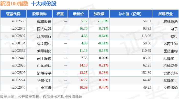 证券之星消息,8月15日,新浪100(399297)指数报收于5810.48点,涨1.73%,成交240.5亿元,换手率2.32%。当日该指数成份股中,上涨的有94家,武商集团以10.0%的涨幅领涨,下跌的有5家,辉隆股份以1.7%的跌幅领跌。