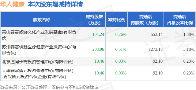 证券之星消息,8月15日华人健康发布公告《华人健康:关于合计持股5%以上股东减持时间届满暨减持结果的公告》,其股东北京道同长菁投资管理中心(有限合伙)、黄山赛富旅游文化产业发展基金(有限合伙)、苏州赛富璞鑫医疗健康产业投资中心(有限合伙)、天津赛富盛元投资管理中心(有限合伙)-嘉兴腾元投资合伙企业(有限合伙)于2025年6月28日至2025年8月7日间合计减持329.12万股,占公司目前总股本的0.8227%,变动期间该股股价上涨5.78%,截止8月7日收盘报15.38元。