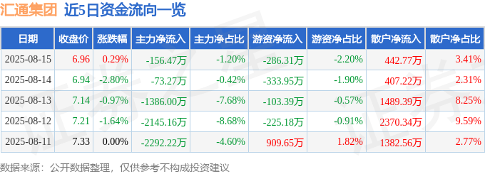 证券之星消息,截至2025年8月15日收盘,汇通集团(603176)报收于6.96元,上涨0.29%,换手率4.07%,成交量18.78万手,成交额1.3亿元。