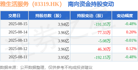 证券之星消息,8月15日南向资金减持191.35万股雅生活服务(03319.HK)。近5个交易日中,获南向资金减持的有3天,累计净减持264.95万股。近20个交易日中,获南向资金增持的有8天,累计净增持252.53万股。截至目前,南向资金持有雅生活服务(03319.HK)3.94亿股,占公司已发行普通股的27.76%。