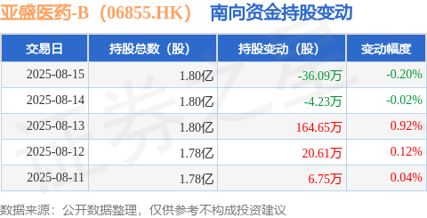证券之星消息,8月15日南向资金减持36.09万股亚盛医药-B(06855.HK)。近5个交易日中,获南向资金增持的有3天,累计净增持151.69万股。近20个交易日中,获南向资金增持的有12天,累计净增持410.7万股。截至目前,南向资金持有亚盛医药-B(06855.HK)1.8亿股,占公司已发行普通股的48.28%。