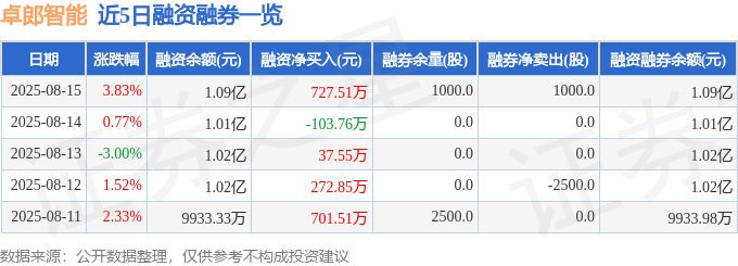 卓郎智能融资融券信息显示,融资方面,当日融资买入2488.14万元,融资偿还1760.63万元,融资净买入727.51万元。融券方面,融券卖出1000.0股,融券偿还0.0股,融券余量1000.0股,融券余额0.27万元。融资融券余额1.09亿元。