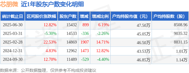 从股价来看,2025年3月31日至2025年6月30日,芯朋微区间涨幅为12.82%,在此期间股东户数增加899.0户,增幅为6.19%。