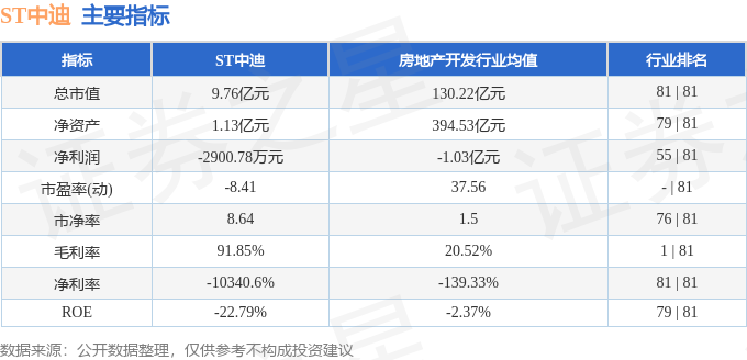 ST中迪(000609)主营业务:以直接投资业务为主,包括直接股权投资业务以及房地产综合开发投资业务等。 ST中迪2025年一季报显示,公司主营收入28.05万元,同比下降99.26%;归母净利润-2900.78万元,同比上升13.36%;扣非净利润-2862.64万元,同比上升11.7%;负债率94.32%,投资收益170.71万元,财务费用2418.79万元,毛利率91.85%。