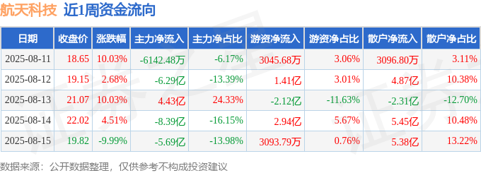 资金流向数据方面,本周航天科技主力资金合计净流出16.56亿元,游资资金合计净流入2.85亿元,散户资金合计净流入13.7亿元。本周资金流向一览见下表: