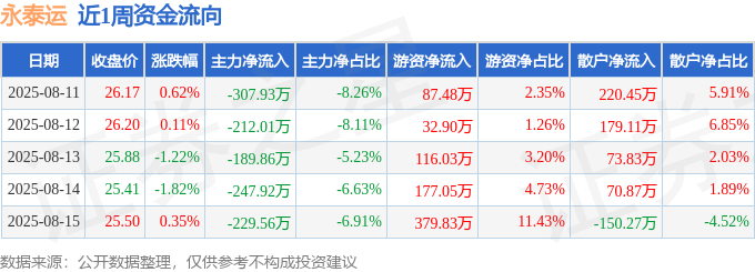 资金流向数据方面,本周永泰运主力资金合计净流出1187.27万元,游资资金合计净流入793.28万元,散户资金合计净流入394.0万元。本周资金流向一览见下表: