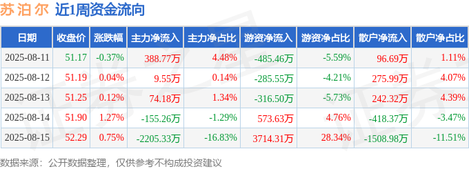 资金流向数据方面,本周苏 泊 尔主力资金合计净流出1888.09万元,游资资金合计净流入3200.43万元,散户资金合计净流出1312.34万元。本周资金流向一览见下表: