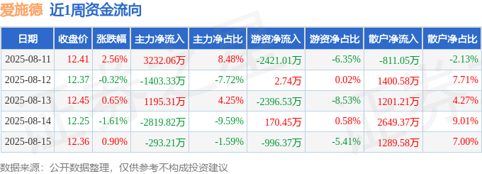 资金流向数据方面,本周爱施德主力资金合计净流出88.99万元,游资资金合计净流出5640.71万元,散户资金合计净流入5729.71万元。本周资金流向一览见下表: