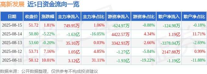 8月15日的资金流向数据方面,主力资金净流入749.95万元,占总成交额1.06%,游资资金净流出624.97万元,占总成交额0.88%,散户资金净流出124.98万元,占总成交额0.18%。