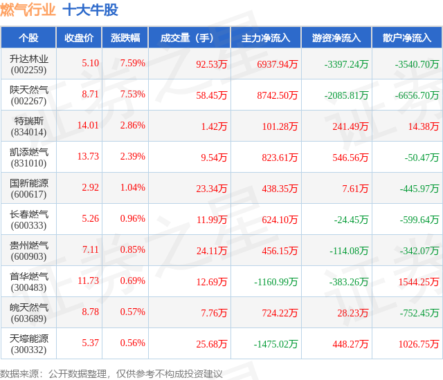 个股表现方面,燃气行业当日领涨股为升达林业(002259),该股当日报收5.1,上涨7.59%,成交量92.53万,主力资金净流入6937.94万元。陕天然气(002267)以上涨7.53%紧随其后,该股当日成交量58.45万,主力资金净流入8742.5万元。除此之外,特瑞斯(834014)、凯添燃气(831010)、国新能源(600617)均进入当日牛股之列。具体个股列表见下表: