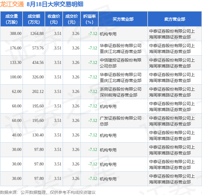 证券之星消息,8月18日龙江交通发生大宗交易,交易数据如下:
