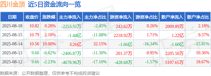 证券之星消息,截至2025年8月18日收盘,四川金顶(600678)报收于10.82元,上涨0.28%,换手率24.45%,成交量85.33万手,成交额9.2亿元。