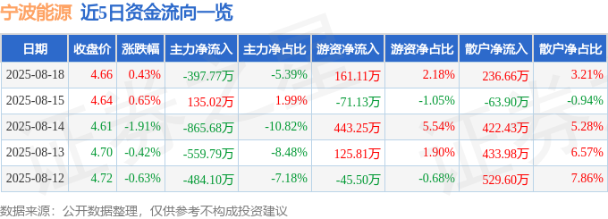 证券之星消息,截至2025年8月18日收盘,宁波能源(600982)报收于4.66元,上涨0.43%,换手率1.42%,成交量15.87万手,成交额7381.03万元。