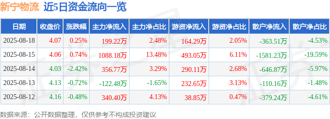 证券之星消息,截至2025年8月18日收盘,新宁物流(300013)报收于4.07元,上涨0.25%,换手率4.42%,成交量19.71万手,成交额8017.58万元。