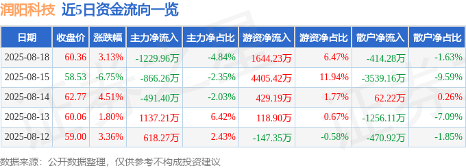 证券之星消息,截至2025年8月18日收盘,润阳科技(300920)报收于60.36元,上涨3.13%,换手率6.45%,成交量4.24万手,成交额2.54亿元。