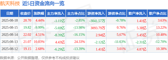 证券之星消息,截至2025年8月18日收盘,航天科技(000901)报收于20.7元,上涨4.44%,换手率24.93%,成交量199.0万手,成交额38.84亿元。