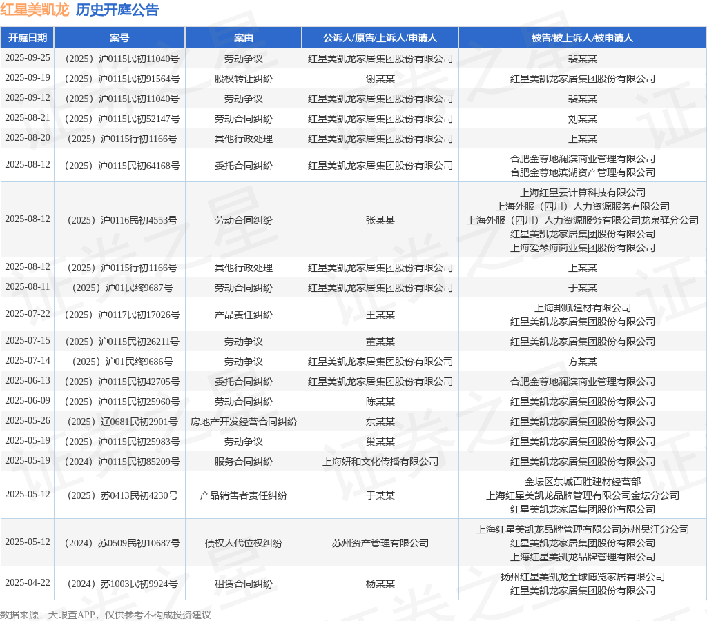 案号:(2025)沪0115民初52147号根据统计,近一年内以红星美凯龙家居集团股份有限公司为当事人的历史开庭公告有69则,其中案由为“劳动合同纠纷”的公告以17则居首,其次为“劳动争议”有10则,“租赁合同纠纷”有7则。历史开庭公告(前20条)如下: