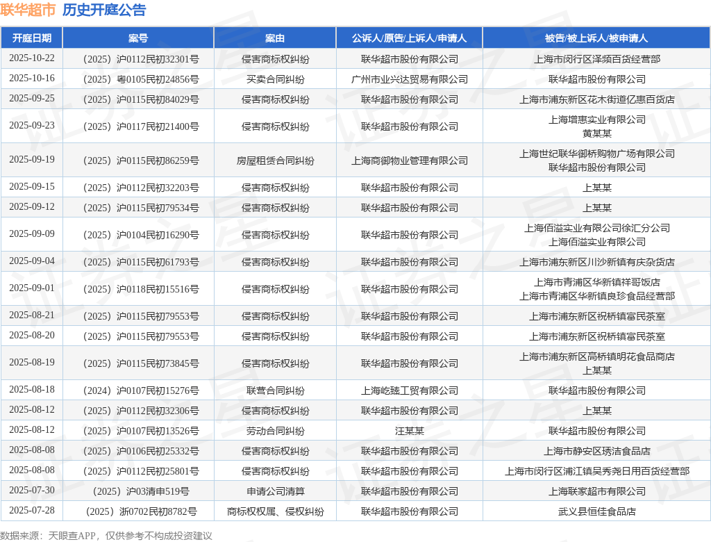 证券之星消息,根据天眼查APP显示,近日公布了一则联华超市股份有限公司作为原告/上诉人的开庭公告,详细内容如下: