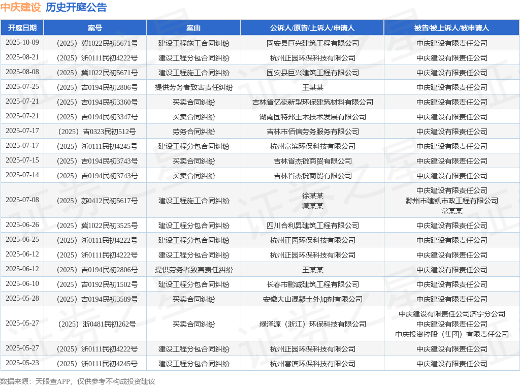 案号:(2025)浙0111民初4222号根据统计,近一年内以中庆建设有限责任公司为当事人的历史开庭公告有85则,其中案由为“建设工程施工合同纠纷”的公告以18则居首,其次为“建设工程合同纠纷”有13则,“买卖合同纠纷”有12则。历史开庭公告(前20条)如下: