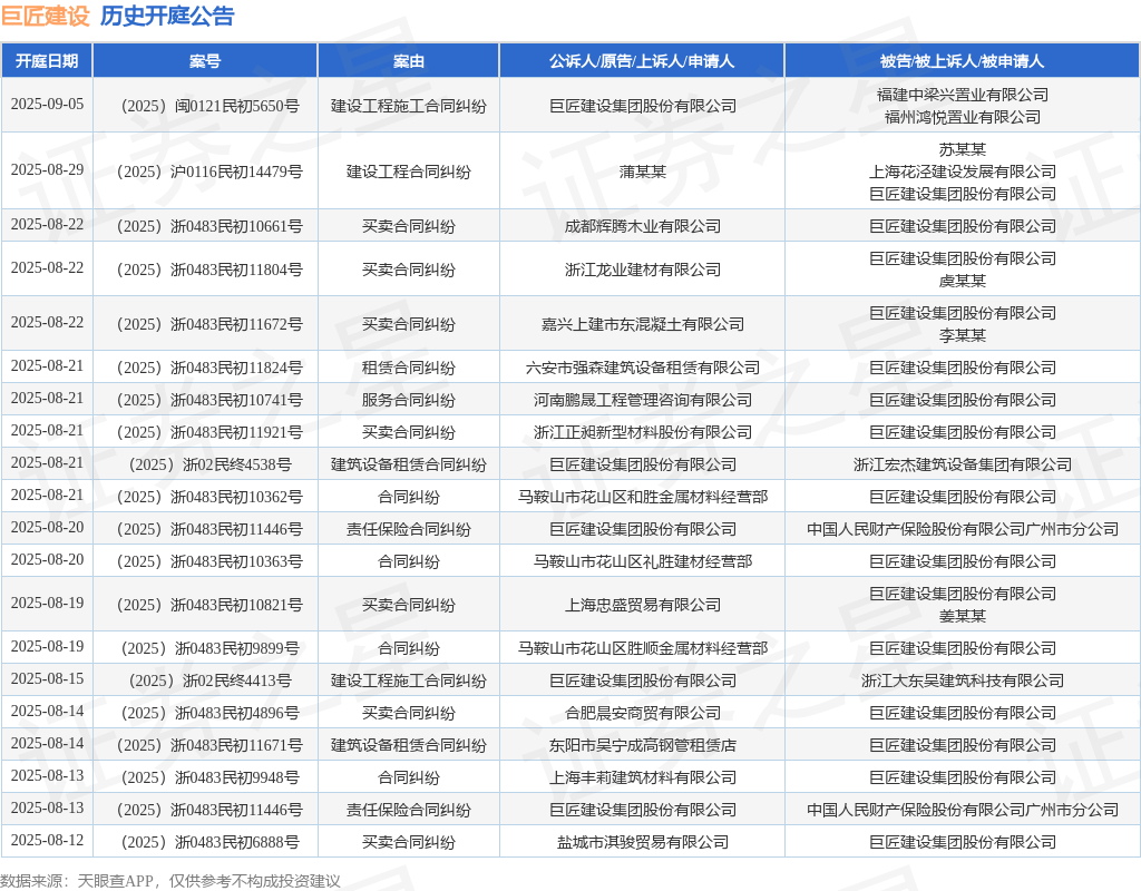 案号:(2025)浙0483民初10741号根据统计,近一年内以巨匠建设集团股份有限公司为当事人的历史开庭公告有277则,其中案由为“买卖合同纠纷”的公告以82则居首,其次为“合同纠纷”有47则,“建设工程施工合同纠纷”有40则。历史开庭公告(前20条)如下: