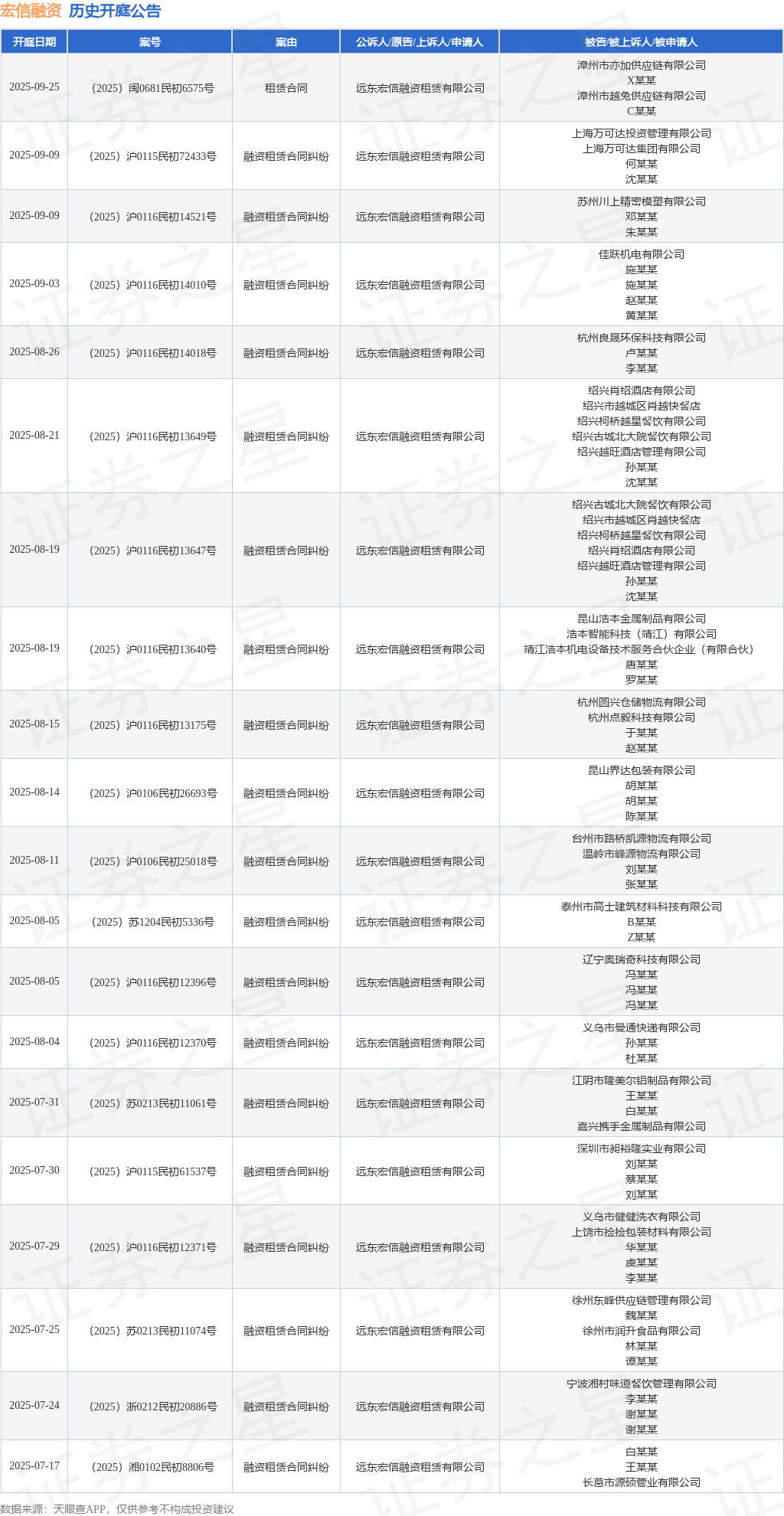 根据统计,近一年内以远东宏信融资租赁有限公司为当事人的历史开庭公告有67则,其中案由为“融资租赁合同纠纷”的公告以65则居首,其次为“租赁合同”有2则。历史开庭公告(前20条)如下: