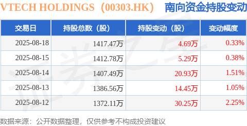 证券之星消息,8月18日南向资金增持4.69万股VTECH HOLDINGS(00303.HK)。近5个交易日中,获南向资金增持的有5天,累计净增持75.61万股。近20个交易日中,获南向资金增持的有20天,累计净增持451.83万股。截至目前,南向资金持有VTECH HOLDINGS(00303.HK)1417.47万股,占公司已发行普通股的5.59%。