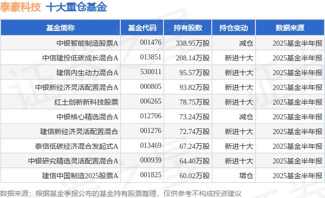 根据2025基金半年报公募基金重仓股数据,重仓该股的公募基金共19家,其中持有数量最多的公募基金为中银基金的中银智能制造股票A。中银智能制造股票A目前规模为10.29亿元,最新净值2.213(8月18日),较上一交易日上涨2.36%,近一年上涨54.11%。该公募基金现任基金经理为周斌。周斌在任的基金产品包括:中银成长优选股票A,管理时间为2022年3月30日至今,期间收益率为-0.47%;中银核心精选混合A,管理时间为2023年12月4日至今,期间收益率为21.65%;