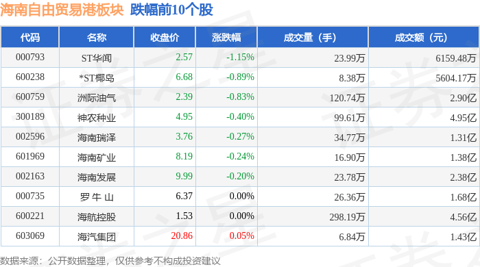 从资金流向上来看,当日海南自由贸易港板块主力资金净流出1.91亿元,游资资金净流入4288.17万元,散户资金净流入1.48亿元。海南自由贸易港板块个股资金流向见下表:
