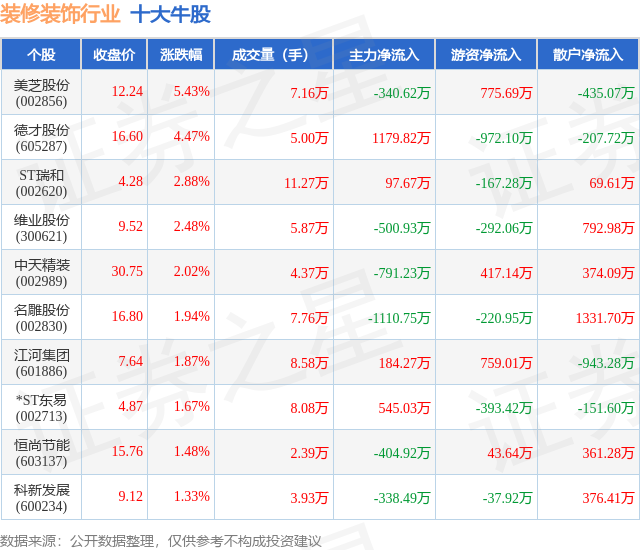 个股表现方面,装修装饰行业当日领涨股为美芝股份(002856),该股当日报收12.24,上涨5.43%,成交量7.16万,主力资金净流出340.62万元。德才股份(605287)以上涨4.47%紧随其后,该股当日成交量5.0万,主力资金净流入1179.82万元。除此之外,ST瑞和(002620)、维业股份(300621)、中天精装(002989)均进入当日牛股之列。具体个股列表见下表: