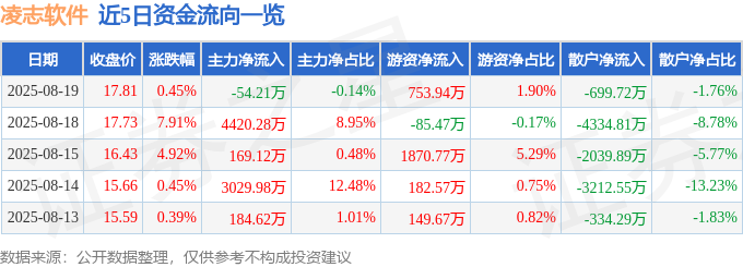 证券之星消息,截至2025年8月19日收盘,凌志软件(688588)报收于17.81元,上涨0.45%,换手率5.57%,成交量22.29万手,成交额3.97亿元。