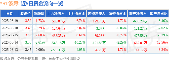 8月19日的资金流向数据方面,主力资金净流入508.84万元,占总成交额6.74%,游资资金净流入129.45万元,占总成交额1.72%,散户资金净流出638.29万元,占总成交额8.46%。