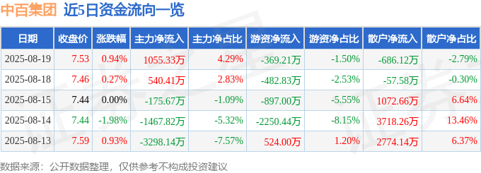 证券之星消息,截至2025年8月19日收盘,中百集团(000759)报收于7.53元,上涨0.94%,换手率4.99%,成交量32.74万手,成交额2.46亿元。